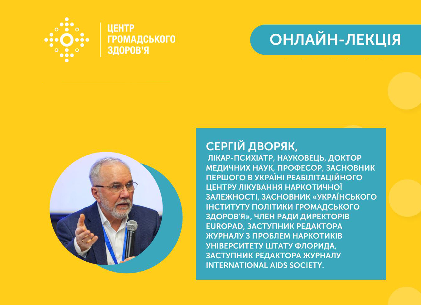 У квітні-червні 2023 року на Youtube-платформі Центру громадського здоров’я України відбулась серія онлайн-лекцій для лікарів замісної підтримувальної терапії. У якості експерта на зустріч зі слухачами був запрошений засновник та провідний науковець Українського інституту політики громадського здоров'я Сергій Дворяк.
